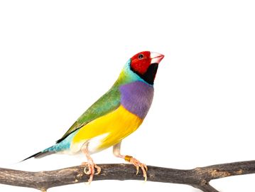 The Gouldian Finch is a vibrant, small finch known for its bright rainbow-colored feathers and peaceful nature, making it a popular aviary bird .