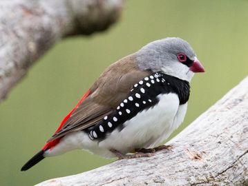 A stunning small Australian finch with a bright red tail, white-spotted black flanks, and a soft grey body. Peaceful, easy to care for, and ideal for aviaries or large cages.